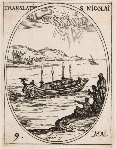 Curator: This delicate etching is Jacques Callot's "Saint Restitua," part of his series on saints, currently residing here at the Harvard Art Museums. Editor: It's remarkably detailed for such a small print! I’m immediately struck by the stark contrast; the saint stands serenely amidst chaos. Curator: Callot was renowned for his etching technique, especially his use of échoppes which allowed him to create incredibly fine lines and capture minute details. The printmaking process itself allowed for wider dissemination of hagiographies in society. Editor: You can see the texture in the water, the precise rendering of the ship's rigging, even the fallen figures on the shore. It really highlights the labor involved and the access it gave the wider population. Curator: Absolutely. And consider the political context; images of saints were powerful tools during the Counter-Reformation, reaffirming the Church's authority. Editor: Still, despite its religious context, the print also underscores Callot’s skill and the democratization of such imagery through printmaking. Curator: A potent blend of faith, politics, and craft, indeed. Editor: I agree; Callot's artistry truly transcends its original purpose.