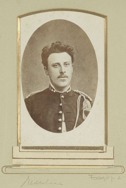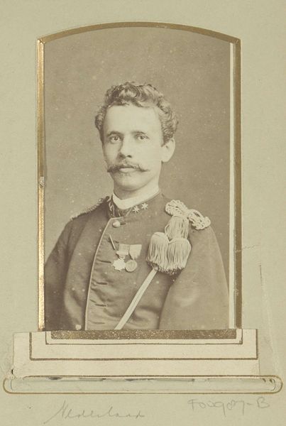 Curator: Looking at "Portret van een (vermoedelijk) Nederlandse militair" or "Portrait of a (Presumed) Dutch Soldier", an albumen print from after 1873 by Friedrich Julius von Kolkow, housed here at the Rijksmuseum. I am immediately struck by the somber mood despite the rigid posture; there's something quite vulnerable in the man's eyes. Editor: The process itself, the albumen print, is significant. Each print required meticulously prepared paper coated with egg whites and sensitized to light. We're seeing a level of artisanal skill rarely applied to photographic portraiture at this scale now. Curator: Indeed, thinking of the production, these types of portraits offered newly accessible visual representation to a broader middle class— though undoubtedly still inaccessible to many. Photography becomes less about artistic mastery and more about documentation, or the semblance thereof. It challenges the class dynamics inherent to commissioned portraiture. Editor: Precisely. Consider the material reality: an officer's uniform, carefully tailored; its embellishments like those shoulder tassels and their braiding, the meticulously waxed mustache—they convey status and power. Think of the labor involved in each thread, each stitch and their origins in colonial exploits for textiles. Curator: I'd also note that, beyond mere representation, the military uniform evokes very particular responses: patriotism, obedience, perhaps even anxiety around the projection of national identity and power. Does it challenge established narratives of Dutch national identity at the time, or reify them? Editor: The uniform is an interesting example. But how does this work speak to evolving masculinity during a period marked by intense social and political change? Curator: By the rigidity it embodies! Male identity so carefully constructed with this impeccable uniform, stiff collar. It invites us to consider what's concealed beneath this carefully crafted image of control, strength, order. I believe this piece allows us a peek beneath its polished surface, hinting at an unease of vulnerability. Editor: These visual fragments provide essential links to historical class dynamics and manufacturing processes. And, what does that offer to today’s makers and activists? Curator: It underscores how our perception of something simple as portrait is profoundly intertwined with culture. Thank you for unpacking all this; the photograph prompts me to consider these figures and production in an entirely different context. Editor: My pleasure, these types of projects require looking beyond the photograph’s subjects and really focusing on who touched it.