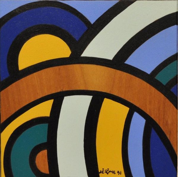 Editor: This is Fernand Léger’s "Project for a mural Vulcania" from 1951, made with acrylic paint. The mural feels playful with its bright colors and strong lines, almost like an abstract cityscape viewed from above. What catches your eye, and how do you read the composition of this work? Curator: Immediately, the stark juxtaposition of primary and secondary colors compels consideration. Léger masterfully employs these flat planes, bordered by decisive black lines, creating a powerful visual rhythm. Observe how these defined forms interact, not to represent objects, but to explore pure relationships of color and shape. It recalls, to a degree, earlier cubist fragmentation, albeit eschewing traditional perspective for a flattened pictorial space. Do you perceive how this affects our reading? Editor: Yes, I see that! The lack of perspective makes it hard to pinpoint a focal point, or even a sense of depth. So it’s about the shapes relating to each other, more than depicting a real scene? Curator: Precisely. The mural, designed for a specific architectural context—'Vulcania'—is less a window onto the world and more an autonomous formal construction. Each color block possesses an independent energy, yet finds balance within the larger composition through proportional relations and strategic placement. Editor: So, you’re saying it is less about what it depicts and more about how the forms create an effect on the viewer? Curator: Precisely. The visual effect emerges from the interplay, a structured dialogue between elements within the frame. Editor: This focus on pure form gives me a completely new way to consider how a painting impacts us. Curator: And perhaps the context it was originally conceived for further heightens our understanding. It's interesting how the pure shapes have meaning, as form itself.