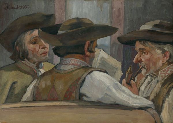 Curator: Paul Cézanne’s "The Card Players," painted in 1893, depicts two men deeply engrossed in their game. Look at the quiet intensity. What's your immediate take? Editor: Stark simplicity. A somber stillness. You feel the weight of tradition, but also, perhaps, the alienation of working-class men passing their time. Curator: It’s fascinating how Cézanne uses a limited palette to create such depth. Notice the geometric structure: cylinders in the bodies, spheres in the hats, all interlocking. It feels like he's building a world, not just recording one. Editor: Right. And the historical context enriches that feeling. The industrial revolution created leisure time, but for whom? The game table becomes this condensed stage for examining class dynamics, gendered spaces. Men, gambling as a masculine social ritual. Curator: But the brushwork is so interesting here. Each stroke feels considered, building towards a unified whole but maintaining its own distinct character. He moves away from idealized representations towards raw perception. Editor: Definitely, though that "raw perception" feels laden with the structures of power. Who gets to represent whom? The working class depicted are allowed a sense of stoicism, not complex humanity. Is Cézanne complicit in this representation, or a critical observer? Curator: I see his formalism as an exploration of that visual tension – trying to capture truth, as he sees it, by dissecting it, visually. Editor: But "truth" is a tricky word. The men at that table represent so many other unseen laborers and societal conditions. The bottle in the center functions almost like an accusatory object: the working man's vice. The men aren't allowed joy, merely grim seriousness. Curator: Still, Cézanne offers something compelling in the solidity of form. Editor: And I find an echo of wider social commentary within it, despite the subdued presentation. Curator: An elegant piece that leaves you contemplating structure, texture, and maybe much more. Editor: It makes us reflect on what isn’t explicitly depicted—the silence, labor and those absent. It lingers in the mind far beyond its immediate presentation.