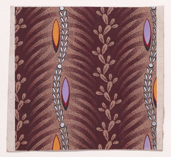 This textile design, made by an anonymous artist, features vertical strips of squares linked by lens-shaped pearls, all arranged over stylized palm leaves and garlands of branches. The squares, reminiscent of architectural foundations, are interspersed along a sinuous path of pearls. The pearls, with their protective amulet associations across cultures, are a potent symbol that has appeared since ancient Sumerian and Egyptian adornments. They represent purity and transformation. The palm leaves, on the other hand, evoke notions of victory and eternal life, motifs that have branched through time from ancient Mesopotamia to Christian iconography. Here, the anonymous artist weaves together the symbols of temporal stability, the pearls, with natural and spiritual victory. The recurring motifs resonate with a collective memory, sparking a psychological interplay between pattern and meaning. The design prompts us to reflect on how symbols persist, adapt, and resurface, echoing through the corridors of time.