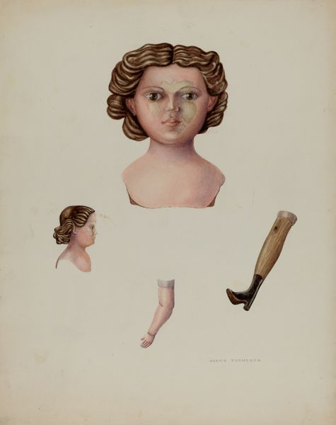 Editor: This is Archie Thompson's "Doll," made around 1941, using pencil and mixed media. There's something unsettling about this image... it’s like a dissected doll laid out for inspection. What’s your interpretation of it? Curator: For me, it speaks to the material construction of childhood itself. We see the individual components – the head, the limbs – almost like a factory schematic. It begs the question: what are the processes, the labor, that goes into producing these objects of play, and by extension, the identities they help shape? Editor: So, it's less about the finished product and more about deconstructing its creation? Curator: Precisely. Notice the "actual size" inscription; it directly connects to the practical dimension, shifting attention toward the labor involved in its physical creation, perhaps revealing gender roles associated with care and domesticity during that era. This invites us to reflect on mass production's impact on individuality and consumption. Do you agree? Editor: It hadn’t occurred to me to think about gender roles, but the scale alongside the representation of parts now illuminates this further, contrasting idealized notions of play and reality of labor, definitely. Curator: It disrupts the idea of a pristine, untouchable object. Thompson confronts us with the hands-on reality of making, repairing, and perhaps even discarding these mass produced objects. Editor: Seeing it through this lens, it becomes a poignant reflection on the economic and social forces that shape our understanding of childhood. Curator: Indeed. Examining art in its historical and material context makes art far more meaningful.