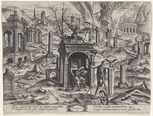 Curator: This striking image is "Brand in het oude stadhuis te Amsterdam" by Jan Abrahamsz. Beerstraten, thought to have been created sometime between 1652 and 1700. It's a dramatic depiction rendered in ink, watercolor, and pencil. Editor: My first impression is of intense energy. The rapid, almost chaotic, strokes used to capture the fleeing crowd contrast sharply with the structural detail of the buildings. There’s a tension between the solidity of architecture and the ephemeral nature of the fire and smoke. Curator: Absolutely. And considering the subject, that contrast is purposeful, I think. This artwork allows us to consider not just the architectural loss but also the social upheaval. The Old Town Hall was more than a building, it was a symbolic representation of civic authority, its destruction a collective trauma for the Dutch Republic. Editor: I can see that in the artist's use of light and shadow. There is little warmth present here – even the fire seems muted, overshadowed by ashy grey. This palette evokes a feeling of hopelessness or, perhaps, the solemn recognition of irrevocable change. Notice how Beerstraten directs the viewer's eye by means of diagonals running toward the towering structure in the center of the image. Curator: I would add that the image reflects the complexities of 17th-century Amsterdam. A global center of commerce and culture brought to its knees by a devastating event. The small figures could be interpreted as a diverse populace, suddenly unified not by prosperity but by disaster and grief. The ladder represents how ordinary people risked life and limb to mitigate the ravages. Editor: The linear perspective enhances this feeling. As the viewer's gaze traces the lines backward into the scene, a deep sense of depth—and thereby of loss—is achieved. The very sparseness of the medium –ink, pencil, watercolor— lends itself to emphasizing the stark and shocking realities present here. Curator: The piece stands as a powerful visual record. It prompts us to consider the fleeting nature of material progress against the enduring resilience of the human spirit. It connects deeply to contemporary discussions about power, social cohesion, and community responses to crisis. Editor: I'm struck again by Beerstraten's expert handling of the visual elements to convey the chaos of a cataclysm. The flames threaten to breach the boundaries of the frame, while at the same time, diagonals focus our eye toward the center—creating, in effect, an arresting interplay.