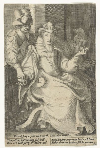 Curator: The Rijksmuseum houses this intricate engraving by Gillis van Breen, made before 1596. It's entitled "Young Woman between a Young and an Old Man". Editor: Well, it certainly exudes a specific mood. There's a somewhat cynical air, a sense of weighing options and consequences, visually captured in the almost oppressive detailing of their garments. Curator: Indeed. The density of detail is quite remarkable, characteristic of mannerism. Observe how van Breen masterfully uses the engraving technique to create depth and texture. Notice the way light falls on the fabrics, especially the young woman’s dress, creating a complex visual rhythm. Editor: Right, there's something about the theatrical composition, typical of genre-painting, which reminds me how prints like this were used to circulate social commentary and moral lessons among a wider audience. What message do you suppose they were hoping to send with the juxtaposition of the figures? Curator: It certainly seems to touch on societal themes such as wealth and aging. Consider the juxtaposition of youth and old age, perhaps symbolising beauty versus experience. Semiotically speaking, there are many readings, all valid. Editor: It feels to me like a snapshot of an era grappling with class distinctions and gender roles. I keep wondering about that woman. How complicit or trapped is she? Her social environment at the time played a huge role in informing a print like this. Curator: Absolutely. Analyzing through a structuralist lens, the woman functions as the central figure mediating these opposing forces – the old and young men, representing tradition versus modernity, perhaps security versus passion. The material quality of the engraving lends a unique presence that speaks to issues that society still grapples with. Editor: It also feels that looking beyond that single figure shows an artwork created in and helping perpetuate a specific male-centered world, whether through its moral judgement or its portrayal of status and relationships. Curator: It's compelling how, through an examination of form and materials, we reveal something deeper about a bygone social and historical context. Editor: And by understanding the period's norms, the artist’s choices in composition take on new meanings for a modern observer.