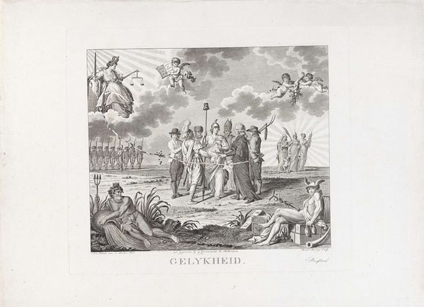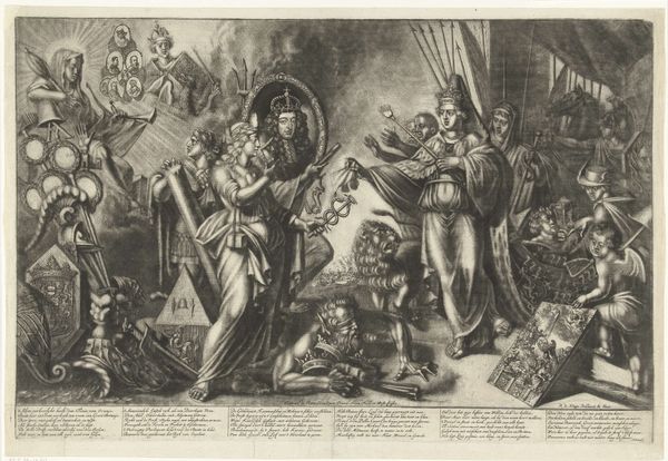 Curator: Before us, we have an engraving dating from 1877-1879 by Emrik and Binger titled "Spotprent op Cromwell, 1656." The print resides here in the Rijksmuseum. Editor: My immediate impression is one of stark contrast and almost feverish energy. The monochromatic palette creates this rather striking drama. What’s your reading of this historical piece? Curator: I see a commentary on power and religious authority in 17th-century Netherlands. Cromwell, astride a grotesque beast, embodies the perceived threat to established Catholic figures represented to his left. This resonates deeply with the sociopolitical tensions of the era, when religious and national identities were fiercely contested. Editor: The composition is striking—how the artist balances these figures. The engraving's linearity gives it a somewhat ethereal feel despite the heavy subject matter. Look at the almost caricaturist style—there's intent there to diminish. Curator: Precisely. The almost comical representation of Cromwell alongside symbols of religious persecution suggests the artists sought to critique his regime's policies. It’s rooted in intersectional understanding of power, specifically challenging his role and the religious authority he represented. Editor: Agreed. There is intent. From a formalist perspective, the use of stark contrast between light and shadow amplifies the emotional weight of the satire. Even if it's heavy-handed. The detailed lines define the subjects here with almost photographic precision for an engraving. Curator: I'd add it is also playing on xenophobia – Cromwell being "othered." His perceived strangeness feeding the beastly representations we see here today. It challenges notions of a homogenous cultural and religious narrative. Editor: I think so, it is about him versus everyone else. Still, you've offered quite a narrative to unravel regarding the work, giving insights that go far beyond simply the subject. Curator: Well, there's so much layered context—narratives intertwined with political struggles, societal anxieties about shifting powers during and following Cromwell’s era—which demands interpretation. Editor: All points well considered. Thank you.