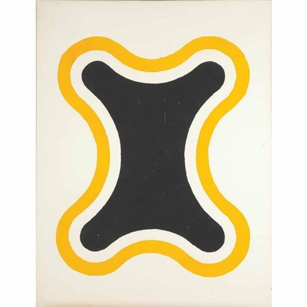 Editor: This is an "Untitled" work from 1962 by Paul Feeley, made with acrylic paint. I'm struck by its simplicity and the contrast between the blue and orange. It almost has a graphic quality to it. How do you interpret this work? Curator: This piece places itself within a pivotal moment where abstraction met the growing influence of mass media and design. Feeley was working in an era deeply impacted by the rise of Pop Art and Op Art. While he predates much of the intense socio-political engagement in art of the later 60s, there's an undeniable visual dialogue happening. The simplified forms and the stark contrast… doesn't it remind you of advertising? Editor: I see what you mean. There’s something very clean and almost…reproducible about it, like it could be easily mass-produced. Was Feeley intentionally commenting on consumer culture, or do you think it was more of an aesthetic choice? Curator: It's subtle, right? He wasn't overtly critical, as some artists were, but by adopting these streamlined forms and a limited palette, he reflects the visual language that was becoming ubiquitous. It prompts us to consider: what role does art play in shaping, or being shaped by, the visual landscape of its time? What happens when painting borrows from the world of graphic design? Editor: So it's less about direct commentary and more about mirroring and questioning the influence of mass media? Curator: Precisely. It becomes part of a wider conversation about the role of the artist and the artwork within a rapidly changing society and the politics of abstraction. Feeley sort of challenges where decoration begins and profound meaning ends. What did you glean from considering this point? Editor: I never thought of abstract art in dialogue with the commercial world, but your reading really opened my eyes to the relationship between art, culture, and social forces. Curator: And hopefully it helps others consider the ever blurring line of “high” and “low” art forms!
