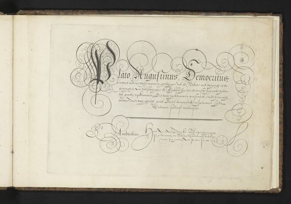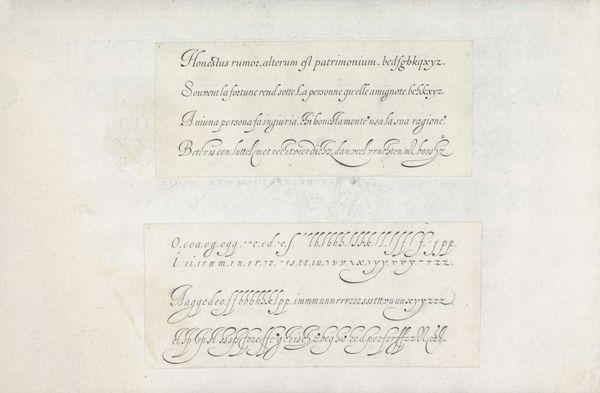 Curator: The careful rendering and precise strokes convey much about the period's ideals of knowledge and skill. What strikes you first about this 1605 ink drawing, titled *Schrijfvoorbeeld: de Nederlandse letter* by Cornelis Dircksz. Boissens? Editor: It feels like a historical document, but also a very personal expression. The ink on paper gives it a delicate, almost fragile quality, while the script itself is so ornate. What's most fascinating to you about this calligraphic drawing? Curator: I am drawn to how calligraphy, historically, serves as more than mere writing. It embodies power structures, class, and access to education. Do you notice how the controlled hand and elaborate forms showcase both the mastery and exclusivity of literacy at the time? Consider the relationship between literacy, power, and gender in early 17th century Netherlands; who had access to this skill and what did it signify? Editor: So it's not just about pretty handwriting? Curator: Absolutely not! It is about how control over language translates to control in other domains. This drawing demonstrates an interesting convergence of art and social commentary when considered alongside socio-economic realities of the era. Do the repetitive, practiced letterforms make you think about labor and production, too? Editor: I hadn't considered the labor aspect before. It definitely brings to mind the intense practice required to achieve such uniformity. Also, the display of dutch letters implies an urge to create or promote a cultural identity. It almost seems political when seen this way. Curator: Exactly! It challenges us to consider calligraphy as more than just aesthetic expression, and allows us to see it as a tool deeply interwoven within the cultural and political landscape of the Dutch Renaissance. It's important to ask: who was this "Schrijfvoorbeeld" for, and what social function did it serve? Editor: It is truly incredible to consider how something as simple as handwriting can contain so much social meaning! Curator: Precisely. Recognizing art’s entanglement with society encourages a more thoughtful engagement.