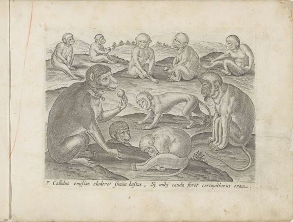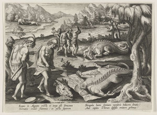 Curator: Welcome. We're looking at Antonio Tempesta’s "Kikvorsen" which translates to "Frogs", an engraving completed before 1650, here in the Rijksmuseum. It depicts two amphibians in the foreground, with a landscape scene playing out behind them. What strikes you initially? Editor: The stark contrast! It’s predominantly monochrome but incredibly detailed. The play of light and shadow on the frogs' skin, the textural quality achieved through line work alone, is mesmerizing. Curator: Tempesta, known for his battle scenes and landscapes, also produced these natural history prints. It’s interesting to consider the labor involved. This isn’t just art; it's knowledge production, contributing to early modern understanding of the natural world. How do you see the composition guiding our eye? Editor: The sheer scale of the frogs commands attention, then your eye traces the horizon, picking out the minuscule human figure, and livestock. Semiotically, the image posits a world seen from an alternative, amphibian perspective, reframing our notions of scale and importance. Curator: I think you’re onto something about scale, considering printmaking as a medium enabled wider circulation of knowledge and imagery across different social strata. A print like this could disseminate new perspectives about animals, landscape and human presence in the same space. Editor: Precisely! What meaning do you derive from the presence of "Bufo" and "Rostro" inscribed under each frog respectively? Curator: Tempesta likely borrowed them from existing encyclopedic inventories classifying natural life, suggesting perhaps these prints would have been bought to form part of a series. Editor: Interesting! Considering the density of the engraved lines, how they build tone and volume, the surface quality...I'm also wondering if the bucolic imagery operates on a symbolic level, too. Is there some commentary on human interactions with nature? Curator: Perhaps. Ultimately, understanding Tempesta’s context—the culture of scientific inquiry, printmaking practices, and patronage—offers a richer understanding of this seemingly simple image. Editor: Indeed. Paying attention to both the composition and its place within the social sphere, illuminates the many lives an artwork can contain.