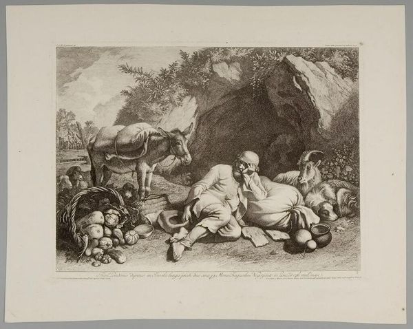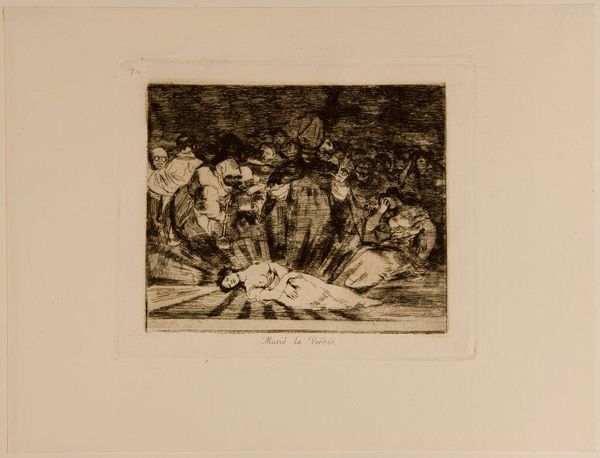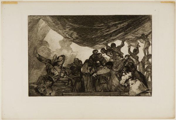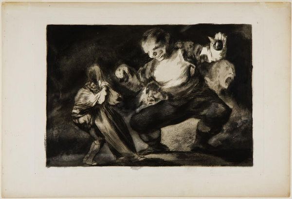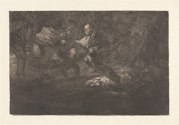 Curator: Goya's print, "God Creates Them and They Join Up Together," presents a rather unsettling scene. What are your initial impressions? Editor: It's somber. The murky tones evoke a sense of dread. I see a fallen figure in the foreground and a gathering of unsettling characters looming above. Curator: Absolutely. Goya critiqued societal and political issues through his art. This piece, with its ambiguous narrative, possibly alludes to power dynamics or social injustice. Editor: The title is interesting, considering how disturbing this scene appears. Is Goya suggesting that even divine creation can lead to problematic alliances? Curator: Perhaps. He often questioned established norms. The darkness and the figures' expressions suggest a world far from divine harmony. Editor: It's a potent reminder of how easily power can corrupt, even under the guise of creation or union. What a powerful piece to reflect upon. Curator: Indeed. It offers a space for critical thinking on history, society, and power.