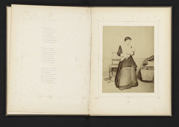 This is a photogravure of a drawing by Johannes Christiaan d’Arnaud Gerkens, depicting a young betrothed woman, reproduced by Maria Hille. The image exists within a book opened to a lithograph poem. During the 19th century in the Netherlands, marriage was strongly linked to social status and economic stability. Looking closely, the woman's posture and clothing reflect the conventions of the time, where modesty and domesticity were highly valued. Yet, the image also exudes a sense of vulnerability; her downcast gaze and clasped hands hint at the emotional weight of her impending marriage. Hille, as a woman artist, navigated a male-dominated art world. The act of reproducing Gerkens’ drawing raises questions about authorship, originality, and the role of women in artistic production. Through her work, Hille challenges traditional notions of artistic genius, asserting her own presence in the art historical record. This reproduction provides an intimate glimpse into the lives and expectations of women in 19th-century Dutch society, as well as the women working at the time.