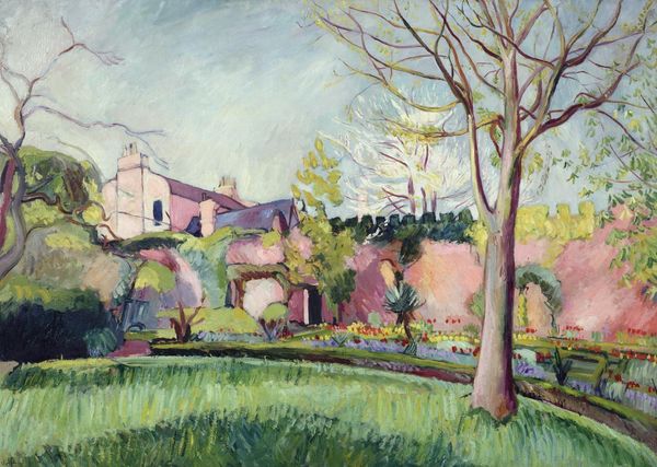 Curator: This is Claude Monet's "Bordighera, the House of the Gardener," painted in 1884. Editor: It's incredibly vibrant! The eye struggles to settle; it jumps all over the canvas with those flecks of color. Is it oil? The materiality really lends to that tactile feel of the foliage. Curator: Yes, it's oil on canvas, created en plein air. Considering the late 19th-century context, painting outdoors allowed Monet to capture the fleeting qualities of light and atmosphere directly. Think of the readymade paints in tubes allowing for a more portable practice, a shift from studio-bound creation to an engagement with labor involved in transporting materials. Editor: Right, and those impasto strokes, the thick application of paint, create a wonderfully textured surface. Notice how the composition is structured? The houses are almost secondary to the riot of vegetation. The sea's horizon, the line behind all that greenery is critical too; it’s bisecting the top of the canvas so neatly and calmly. Curator: Monet spent time in Bordighera specifically to capture the unique light and vegetation of the Italian Riviera. This wasn't simply about depicting a beautiful scene, though—consider the labor involved in cultivating and maintaining such a garden. The "house of the gardener" suggests a working relationship to the landscape, not just a passive observation. Who exactly were the garden workers? What did it mean for them to make and care for this spectacle? Editor: Interesting point. From a formal perspective, that dense layering of greens, yellows, and reds is almost overwhelming. And then your eye hits those rectilinear house shapes as they contrast to that foliage in the immediate foreground; there is such a fascinating dialog established. How does this fit into the overall arc of his Impressionist project? Curator: It reflects the Impressionist fascination with capturing transient moments but also marks a shift towards a more subjective, expressive style which is categorized under post-impressionism.. Think of Monet later at Giverny! Here he’s responding to specific conditions of the Riviera; the accessibility of premixed colors and transportable painting easels further liberated artists to document specific environmental spaces in short windows of time. Editor: Fascinating how those innovations affected everything about process! Thank you for highlighting the historical circumstances and for adding some new perspective on something I looked at only formally just moments before. Curator: My pleasure. I appreciate your fresh, incisive read on its composition, as well! It is always useful to remind people about all of the economic processes behind what appears simply as a "beautiful view" in art.