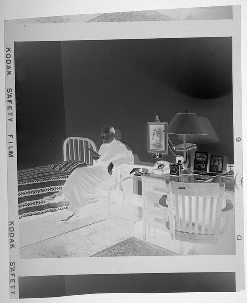 Editor: This is "Untitled (chimp playing the piano)" by Jack Gould, and it's a small, striking photograph. The chimp in its little outfit is both amusing and unsettling. What can you tell me about the context of this image? Curator: This image operates within a complex history of animal representation. Circuses and performances often exoticized animals, reinforcing human dominance. Do you think this image challenges or perpetuates that power dynamic? Editor: I'm not sure. It feels a bit exploitative to me, but maybe it's also trying to be funny? Curator: Exactly. It's a photograph that reveals more about cultural attitudes than about the animal itself. Understanding that tension helps us interpret its power. Editor: I never thought about it that way. Thanks! Curator: Of course! Looking closely reveals so much.