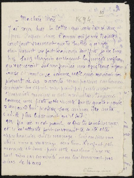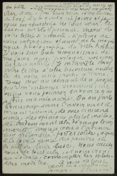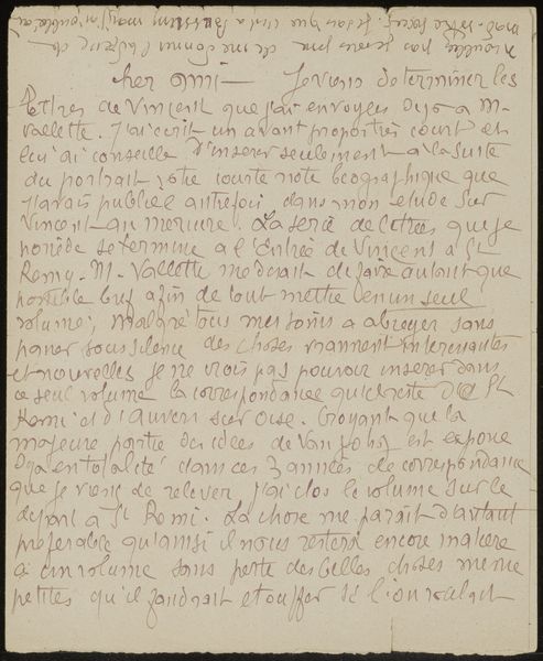 This is a letter to Emile Bernard, undated, composed of ink on paper. The grey text, dense and looping, fills nearly the entire page. It's like a field of tangled lines, a choreography of the hand. I'm drawn to the way the words blur and bleed into each other, obscuring the message, but amplifying the feeling. Look how the loops of the 'l's and 'e's form little knots, almost like doodles. I see these tiny gestures as a kind of emotional overflow, where the act of writing becomes as important as the content. The letter’s texture is created by the variable pressure of the pen. This makes me think of Cy Twombly's scribbled paintings. He wasn’t making exact copies of things, he was creating his own language of art. Both artists remind me that art is about the messy process, where meaning isn’t fixed but emerges through the doing. It’s about embracing the unpredictable and finding beauty in the imperfect.