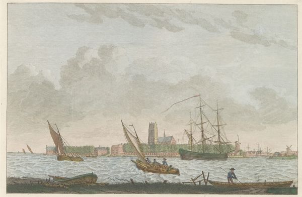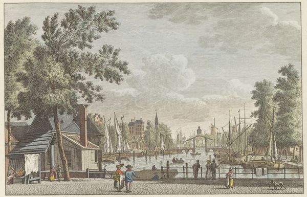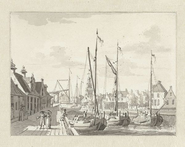 Editor: Here we have Carel Frederik Bendorp's "Haven van Middelburg," created circa 1790. What are your initial thoughts? Curator: A somber piece. The composition is carefully ordered—the vertical masts against the horizontal of the quayside. But the washed-out palette evokes a certain melancholy. It feels like a faded memory. Editor: Interesting you say "memory". For me, the charm lies in the material process itself. The evident pencil work overlaid with watercolour reveals the artist’s hand and their labor of careful documentation of this industrial harbour. Think about the craftsmanship involved! Curator: Undeniably. Yet, the strategic use of negative space guides the eye. Notice how the ships create a rhythmic progression into the distance, a mirroring effect balanced by the buildings on the left. It invites a deconstruction of space itself. Editor: I am also drawn to the textures; consider the aged paper, and think of how that affects the presentation of labour at play along the dock. Curator: Indeed. And let us not forget the semiotics. Water, throughout art history, serves as a visual trope of commerce, but also transformation. This liminal space of harbour reflects those potentials of comings and goings. Editor: A valid reading, yet let’s bring the physical presence of these materials back in: each layer hints at historical production, trade routes across water. Curator: Perhaps, yes, in its purest form, this work offers us both planes: the external world mediated through the materiality of pigment and paper, but also through its formal architecture, a contemplation on stillness amid movement. Editor: Ultimately, an insightful moment where artistic process reflects historical record.