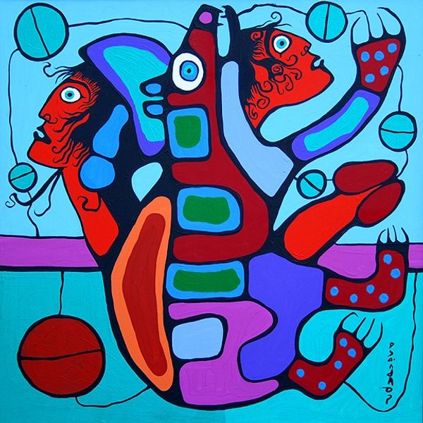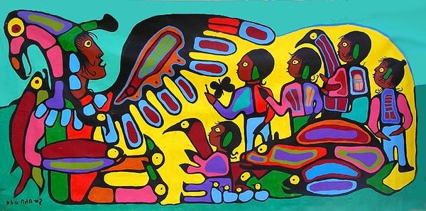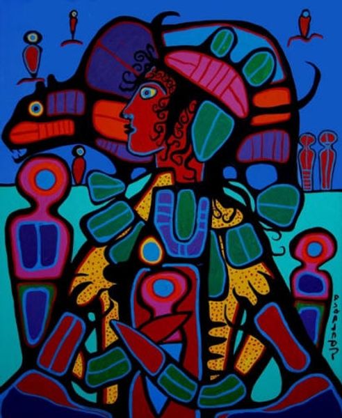 This painting, "Bird Family with Fish," was created by Norval Morrisseau, using acrylic paint on canvas. Morrisseau was a self-taught artist from the Ojibwe First Nation in Canada, and is known for his vivid colors, bold lines, and the use of traditional indigenous imagery. The flat, bright colors and strong outlines are typical of his style, which blends traditional Ojibwe stories with modern art techniques. The painting depicts a family of birds perched on a fish, with the composition divided into two distinct color fields. The application of paint appears straightforward, emphasizing the graphic impact of the image. There is a directness in its execution. Morrisseau's art often explores themes of spirituality, nature, and the relationship between humans and animals, deeply rooted in his cultural heritage. He challenges conventional art boundaries by integrating indigenous knowledge and aesthetics into contemporary art. By valuing the narrative and cultural significance embedded in the imagery, we move beyond formal analysis and recognize the profound layers of meaning within Morrisseau's work.