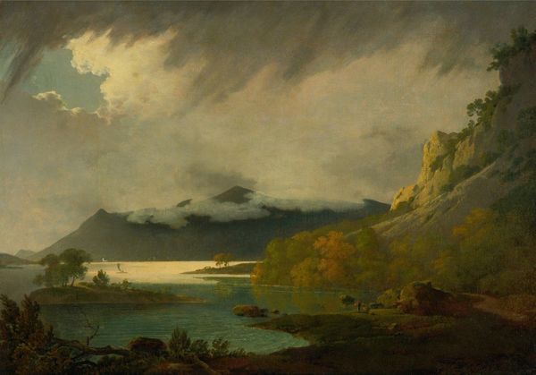 Albert Bierstadt painted "On the Sweetwater near the Devil’s Gate," a landscape, likely in the 1860s, during the expansion of the American West. This image speaks to the cultural moment of Manifest Destiny, the belief that American settlers were destined to expand across the continent. It represents a desire to transform the landscape, and reflects the politics of imagery, particularly in the context of westward expansion. Bierstadt romanticizes the Wyoming Territory, presenting a vision of sublime natural beauty, hinting at the possibilities of the land and the prospects it holds for those who settle it. The luminous sky, combined with the rugged terrain, speaks to both the promise and the challenges of the West. The small figures can be read as an invitation, an open door to the viewer who might see themself reflected in this image. Understanding this artwork requires considering the social conditions that shaped artistic production. Primary source documents, such as letters, diaries, and travel narratives, can shed light on the historical context and cultural values that influenced Bierstadt's vision.