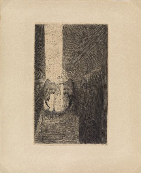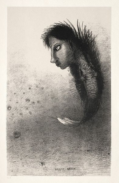 Odilon Redon created this unsettling lithograph, titled 'The Marsh Flower, a Sad Human Head,' in the late 19th century, using stark blacks and whites to create an atmosphere of dreamlike unease. The composition marries organic and human forms into a hybrid entity. The print's meaning emerges from its structural tension: a drooping flower stem supports a human head, its forlorn expression amplified by the dark, reflective waters below. Redon's technique creates a visual paradox. The head is softly rendered and contrasts sharply with the botanical structure of the flower. This juxtaposition challenges fixed notions of beauty and the grotesque, reflecting contemporary philosophical debates about nature and human existence. Redon’s symbolism invites ongoing interpretation. Is the flower a metaphor for fragile beauty or a commentary on humanity’s alienation from the natural world? The lithograph destabilizes established categories, prompting a deeper reflection on perception and meaning.