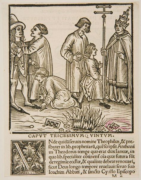 Editor: This is Illustration IV, by an anonymous artist, held at the Harvard Art Museums. The stark black lines create a scene with a rather somber atmosphere. I'm curious about the composition. What do you see in this piece? Curator: Observe the linear quality, the stark contrast between light and shadow. The artist's use of hatching and cross-hatching creates form, but also delineates a clear hierarchy. Note how the seated figures dominate the visual space. Editor: So the composition itself suggests a power dynamic at play? Curator: Precisely. The figure on the ground, rendered with the same linear precision, becomes subjugated not just by subject matter, but by the very structure of the image. Do you see how the lines direct your gaze? Editor: Yes, I see that now. It’s like the lines themselves are enforcing the power dynamic. I hadn't considered how much the technique itself contributes to the meaning. Curator: Indeed. A careful consideration of form reveals the underlying structure of the work.