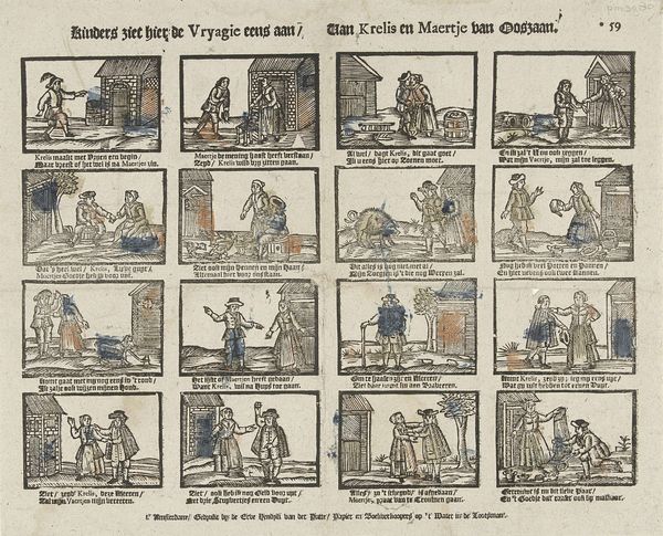 Editor: This print, dating from somewhere between 1725 and 1780, is called "Hier ziet gij met vermaak de kinders opgetogen / En ook een ouders pligt alk na zijn vermogen" by Johannes Kannewet II. It feels like a glimpse into a world both familiar and distant. What strikes me is the organization – all these little scenes in a grid. What do you see in this piece? Curator: I see a fascinating distillation of the human lifecycle, especially concerning children and families, presented through a culturally specific lens. The grid format itself is significant; each vignette functions as a self-contained emblem, a symbolic representation of a stage or activity. Do you notice any recurring motifs or objects that might carry symbolic weight across these individual scenes? Editor: I suppose children are central, and so are domestic settings... also the presence of elders in many scenes suggests continuity or guidance. Curator: Exactly. The constant presence of adults underscores the importance of familial and communal structure, reflecting a society where roles and responsibilities are clearly defined and transmitted across generations. These aren't merely scenes of daily life; they're carefully constructed images intended to instruct, to reinforce cultural values around childhood, labor, marriage, and community. Notice the clothing of the subjects, doesn’t it give you an insight into Dutch society and moral conduct of the era? Editor: Yes, that is fascinating. The somber tones of the clothing, especially on the women, signal a seriousness of purpose. I’m really learning about how images work like cultural time capsules. Curator: Indeed, and it showcases how persistent the symbolic function of images can be over time. Each image in this grid invites us to contemplate enduring human experiences from different cultural and social angles.