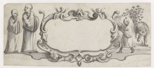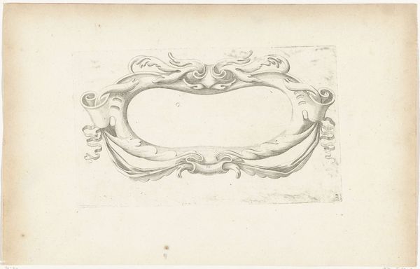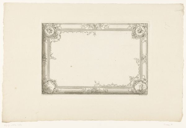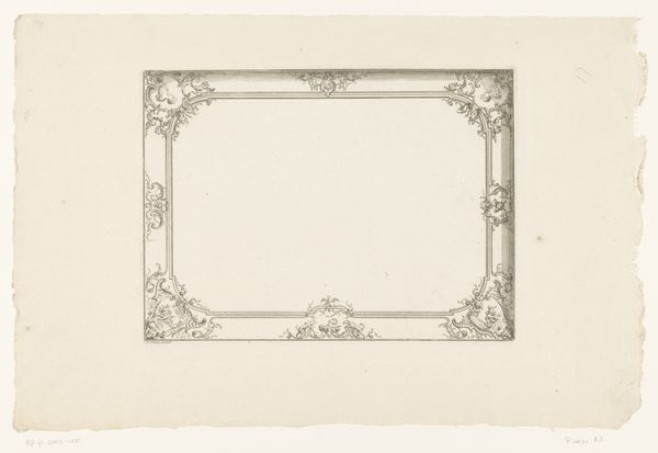 Editor: This is "Omlijsting met bloemen en kransen," or "Border with Flowers and Garlands," a pen and ink drawing from 1778 by Pierre Gabriel Berthault. It has such delicate floral patterns. What do you make of it? Curator: I see a fascinating artifact that transcends mere decoration. Think about the late 18th century. Floral motifs were almost aggressively used by those in power—they were literally framing their world! How do these decorative borders, intended for perhaps a mirror or a print, function as both assertion of and constraint? Editor: Constraint? How so? Curator: The frame, even a floral one, is still a boundary. What does it mean to confine beauty, to control its presentation? Who benefits from this controlled aesthetic? Consider also that luxury items and artworks were usually made possible by exploitation of resources and labor. Can we ignore that history? Editor: So, the beauty is almost… deceptive? Covering up something darker? Curator: Precisely! This drawing, while beautiful, can prompt questions about power dynamics, privilege, and even environmental exploitation of the time period. We see this Baroque frame. But whose stories are left outside the frame? Editor: Wow, I hadn’t considered that a seemingly simple drawing could have so many complex layers! It makes you think about what isn’t shown, and whose stories aren't being told. Curator: Exactly, and by questioning the context we see far more than just flowers, don't we?