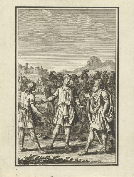 Jacob Folkema created this print, "Telemachus Kneeling Before Mentor," using engraving techniques. The composition is strikingly organised with a strict horizontal baseline and a symmetrical arrangement of figures and classical architecture. Folkema uses precise, parallel lines to model forms, creating a sense of depth and texture through varying densities of hatching. The act of kneeling—a posture of supplication—is central here. It suggests a hierarchy, with Mentor in a dominant position. This transaction is further reinforced by the architectural backdrop, which conveys a sense of historical and intellectual heritage. The detailed linework, particularly in the clothing and landscape, evokes a sense of order and clarity, aligning with the Enlightenment's emphasis on reason and structure. Folkema's print invites viewers to reflect on themes of mentorship, power, and the transmission of knowledge within a classical framework, as well as the cultural codes used to convey these meanings.