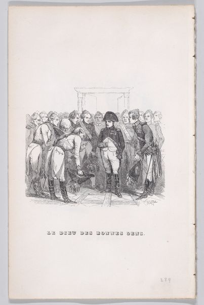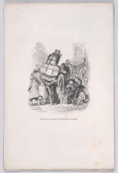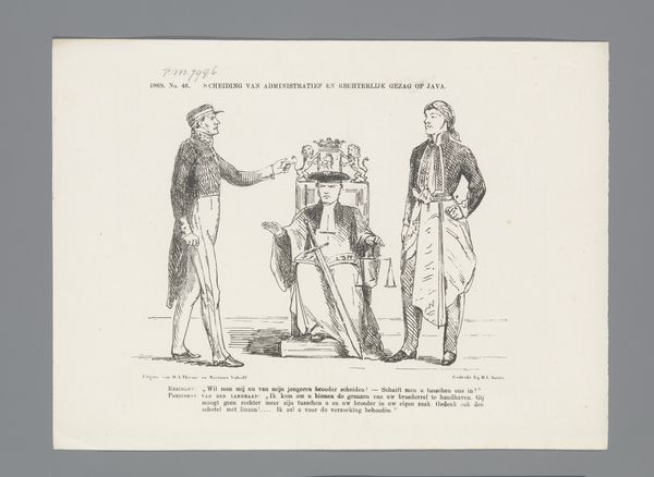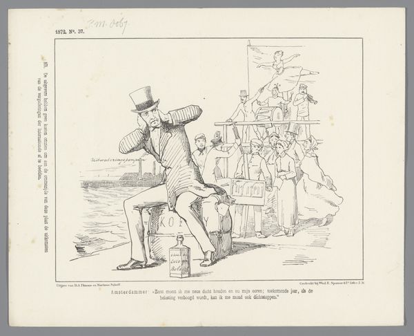 Editor: Here we have a drawing entitled "Politieke Spotprent, 1882" from Johan Michael Schmidt Crans, made using ink. It looks like a political cartoon, maybe commenting on the government, and I am intrigued by the presence of Dutch text in it. What’s your take on it? Curator: It’s interesting you see it that way. Indeed, "Politieke Spotprent" translates to 'Political Cartoon,' which gives us a good starting point. Considering it's from 1882, a time of burgeoning social movements and industrial unrest across Europe, we should investigate how this drawing reflects the political climate. What elements in the drawing make you think it comments on the government? Editor: Well, the words "STAATS KOETS," which I guess means 'state carriage,' seems important, especially with figures crowded around it. Also, the title "Algemeene Werkstaking" makes me feel like the cartoon comments on the sociopolitical movement occurring in Europe in the late 19th century. Is that a viable interpretation? Curator: Absolutely. The carriage symbolizes the government or state, and the crowd suggests public opinion or perhaps pressure. The mention of a "general strike," or "Algemeene Werkstaking", frames the artwork within labor disputes and power struggles. Knowing this, does the visual of everything, the "alles," going away strike you as an appeal for a return to the previous conditions or an argument against the current status quo? Editor: It's hard to say definitively, but with the phrase implying the state carriage might lead to negative situations "maar bet is er ook naar", makes me believe this is not an endorsement. I now feel like Crans wanted to paint a nuanced commentary of the political issues. Curator: Exactly! The ambiguity is vital. It encourages viewers to contemplate the consequences of actions taken by the "State Carriage" amidst labor movements. And it is here where political cartoons fulfill their civic role: opening public discourse around political actions. Editor: This gave me more insights on how artists participate in the shaping of culture. Curator: And it’s also about how viewers, like us, engage with these historical dialogues.