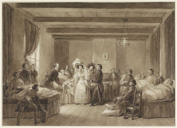 Joseph Fischer created this print, Evening Gathering in the Palais Fries, using etching, a process with a long and fascinating history. The visual effect of etching comes from its indirect method. The artist covers a metal plate with a waxy, acid-resistant ground, then scratches an image into that surface, exposing the metal. Immersing the plate in acid then bites away at the exposed lines, creating grooves. These grooves hold ink, which is then transferred to paper under pressure, producing the final print. Look closely, and you can see the characteristic velvety quality etching creates. The image captures a moment of social exchange, perhaps a presentation of architectural plans or artworks. Each figure is rendered with careful attention to detail, thanks to the incisive nature of the etching process. Etching allowed for the relatively quick reproduction of images, making art more accessible to a wider audience, and reflecting a shift in artistic production towards broader consumption. Understanding the labor-intensive process of etching, and its role in disseminating images, adds another layer to our appreciation of Fischer's work.