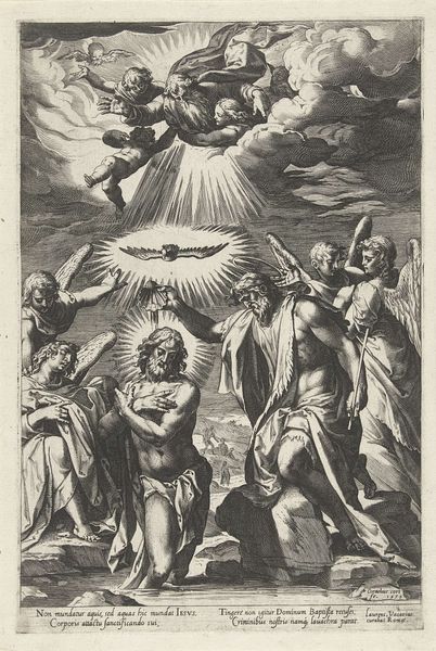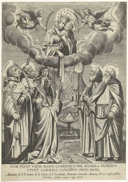 Editor: This engraving, "Christ, the Virgin, and Saint John the Baptist with Saints Paul and Catherine," is possibly from the 1520s, made by Marcantonio Raimondi. It feels like a very formal composition. What’s going on with the figures in the upper register appearing to float? Curator: They're in celestial space. Notice how the symbols reinforce their roles: the radiance around Christ, the book referencing knowledge in St. John. Catherine’s wheel alludes to her martyrdom and Paul is carrying his sword, the instrument of his death. The landscape separates these divine figures from the terrestrial plane. What does that division communicate, do you think? Editor: I guess it emphasizes the holiness, but the two halves don’t feel connected somehow. The poses are really distinct between the upper and lower parts of the work. Curator: Yes, but they are intimately connected by the Christian narrative it conveys. The carefully rendered clouds and heavenly light meet Paul and John. Raimondi wants us to see the full glory and path to it in these contrasts. The upward gazes link earth with Heaven and human labor with a divine goal. It makes me think about ritual and transformation. Editor: So you're saying the artist isn't just showing us a scene but is really guiding us through spiritual ideas. It is like he's layering cultural symbols to teach a larger truth. Curator: Precisely! It asks us to see beyond the surface narrative. A sort of journey through life guided by faith. Editor: I hadn't considered all of that. The symbols really enrich my understanding and give much more depth than initially noticed. Curator: These early printmakers offer so much through their layered details and a real insight into the world of religious belief.