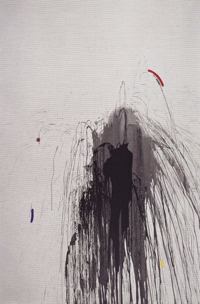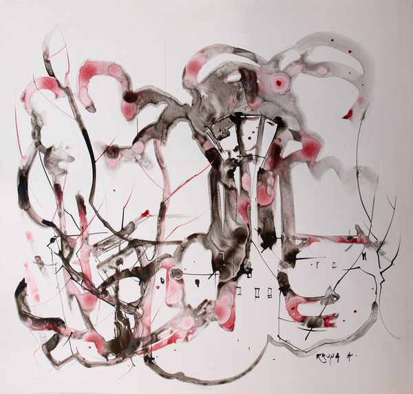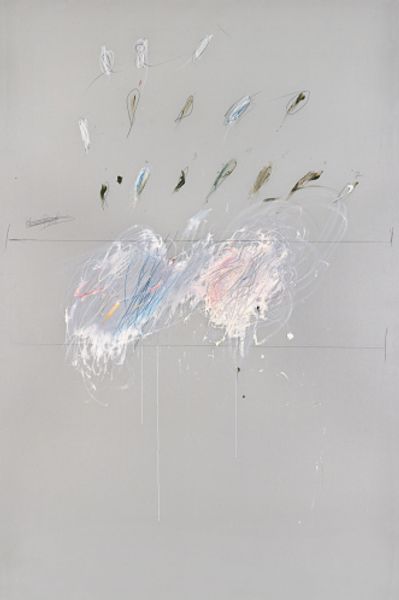 Editor: This is Cy Twombly’s "Nine Discourses on Commodus, Part II" from 1963. It’s a painting, with lots of visible gestural ink work. I’m really drawn to the starkness, the contrast between the violence of the red marks and the relative emptiness surrounding it. What formal qualities stand out to you? Curator: The application of line, certainly. Note the aggressive, almost violent quality of the red scrawls against the muted background. The linear elements create a field of tension. Consider how the composition is weighted, with the cluster of marks floating almost centrally, yet tethered by drips. This organization allows a reading that emphasizes not only materiality and movement but also a delicate equipoise. Editor: Equipoise… you mean a sense of balance? The asymmetry almost feels disruptive to me. Curator: Precisely! But look again – isn’t it the very imbalance that generates a dynamic equilibrium? The way Twombly uses the raw canvas also highlights the artwork as an object rather than an illusion. What does that incompleteness do to your interpretation? Editor: I guess that the piece emphasizes form itself, its materiality…rather than suggesting something beyond the work itself. Curator: Exactly. Now consider the relationship between line, color, and ground. Does the painting open any new questions for you concerning process and abstraction? Editor: Yes, absolutely. It challenges my expectations. I tend to want to know what a piece is 'about,' but here the 'aboutness' seems to reside in the artistic process. Curator: An apt conclusion. Twombly encourages us to value the visible act of creation, emphasizing form and surface as content themselves.