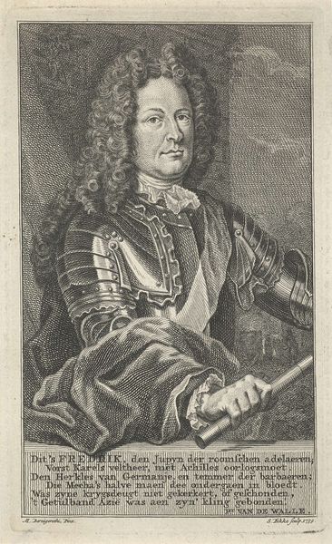 Editor: This engraving from the early 1700s by Pieter Schenk, titled "Portret van Anton Gunther, hertog van Schwartzberg," it's striking! All that armour, contrasted with that enormous wig - what do you make of this image? Curator: Well, first off, I see a man doing everything he can to scream "power!" It's like he's saying, "Yes, I wear a ridiculous wig, but LOOK at this imposing metal shell – try arguing with me now!" Isn't it wonderful how art can be a form of theater? You almost expect him to burst into an aria. The engraver does invite our gaze into a dance between vanity and might. The flowing lines of the hair create this elaborate frame, almost mocking the rigidity of the armour. Don't you think? Editor: Absolutely, I can see that. It's a bit funny, actually, in a way I don’t think was originally intended! But the humour makes it engaging, I feel more curious about him, the duke. Curator: Exactly! It’s that little smirk of irony that gives it spice. He’s trapped in amber, forever signaling authority, yet somehow manages to wink at us across the centuries. That rigid armour—symbol of power—becomes a costume! Almost endearing, isn't it? Editor: I agree, seeing the artifice, the staged nature of the portrait changes how I perceive the Duke. Curator: And there you have it! Art doing its magic. Challenging our perceptions, inviting us to question what we think we know, and to smile just a little. It’s a rather brilliant send-up of power, and humanity, wouldn’t you agree?