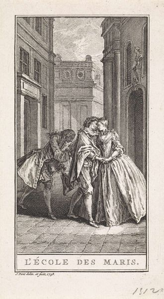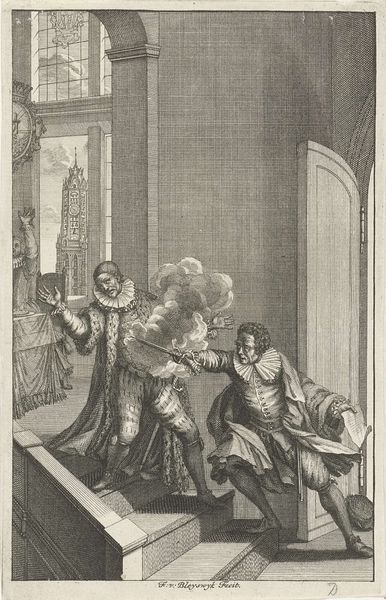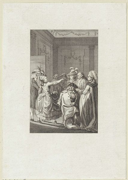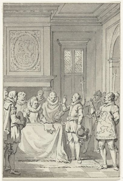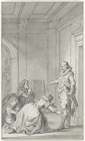 Editor: This drawing, created between 1788 and 1790 by Jacobus Buys, captures a really poignant moment. It's called "The wife and mother of Floris de Montmorency, Baron de Montigny, plead with Anna of Austria for intercession for Montigny, who is held captive in Spain." The somber tone and dramatic body language really strike me. What do you see in this piece, particularly when thinking about the symbols it might employ? Curator: It's true; the body language speaks volumes. Buys uses figuration, both literally and figuratively, to convey the emotional weight of this historical appeal. Notice how the architectural elements – the arches, the columns – reinforce a sense of hierarchy and the almost insurmountable power Anna of Austria embodies. It echoes the long tradition of representing power, a cultural memory of sorts, reaching back to classical imagery. The supplication of the figures becomes all the more impactful against this backdrop, doesn't it? Do you see any recurring visual motifs? Editor: Definitely, the motif of hands praying is powerful, showing submission and desperation. It also looks like Buys has made the figures look more distressed with each step away from the viewer: the closest one weeping in submission, the next, withered, on her knees, and lastly, the distant group with visible sorrow. But is this image relying on pre-established visual symbols? It feels more staged somehow. Curator: That's a perceptive point. While not reliant on established religious iconography, Buys certainly draws upon established visual rhetoric – conventions used to signal specific emotional states and social relationships. The placement of figures, the emphasis on gesture, even the controlled use of line and shadow—all of these elements contribute to a carefully constructed narrative. The halberdier standing behind Anna, the light and shadow he casts, reinforces this theme and Anna’s position. How does it sit with you now? Editor: It makes more sense, knowing the weight each figure carries in this drawing. It's no longer just a historical snapshot, but a calculated representation of power, despair, and the universal language of supplication. Curator: Precisely. And through these symbols, this piece speaks not only of a specific historical event, but also of enduring human struggles – the plea for justice, the pain of loss.