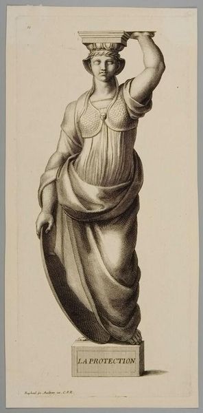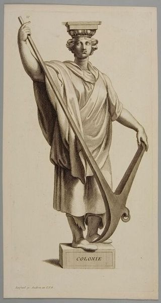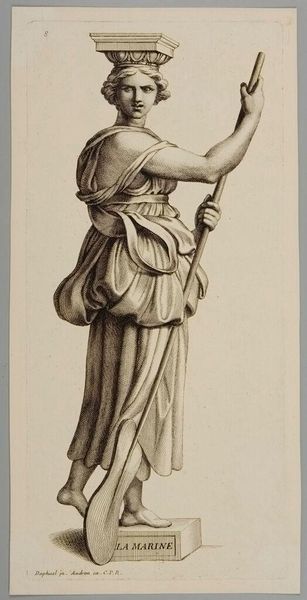 Editor: This print, titled "Navigation" by Gérard Audran, shows a classical figure standing on a pedestal. The level of detail seems really impressive. What's your take on this piece? Curator: Let's consider the means of production. Note the lines, carefully etched to create the illusion of depth and form. How does the materiality of the printmaking process itself – the labor, the copper plate, the ink – inform the representation of this allegorical figure? Editor: That's interesting! I hadn't thought about the actual process of making the print. Curator: What does it mean to reproduce and circulate images of classical ideals through printmaking in this period? How does this relate to broader patterns of consumption and knowledge dissemination? Editor: It's fascinating to think about how the print makes this statue, and navigation itself, more accessible. Curator: Precisely.