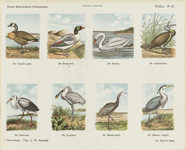 Ernst Fröhlich made this print, Vogels, sometime in the 19th century. It is made from paper and ink, common materials that enabled the wide circulation of images in a newly industrialized society. This print is a lithograph, a process involving drawing on a stone or metal plate with a greasy crayon, then using ink to transfer the image onto paper. This technique allowed for relatively quick and inexpensive reproduction, making images like these accessible to a broad audience. Look closely, and you will see how the printed medium informs the artwork's appearance; the texture of the paper, the slight blurring of the ink, and the flat planes of color. Each of the birds is carefully rendered with scientific precision. Prints such as these reflect changing social values and labor practices in the 19th century, documenting scientific advancements and increasing access to knowledge through mass production. "Vogels" shows how materials and making processes are tied to wider issues of labor, politics, and consumption. The image embodies these social and cultural forces, challenging the conventional separation between art and craft.