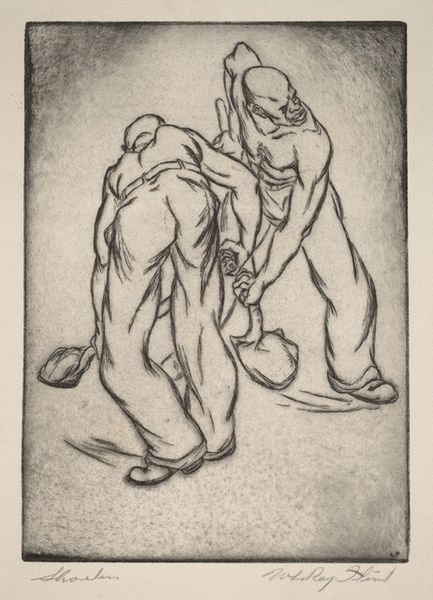 Editor: Here we have Charles Haslewood Shannon's "Study for an Entombment," a drawing at the Harvard Art Museums. The somber mood is heavy, amplified by the grey scale, and the figures seem suspended in grief. What compositional elements stand out to you? Curator: The somber mood you note arises from the interplay of light and shadow. Notice how Shannon employs chiaroscuro to sculpt the figures. The strong diagonal axis, anchored by the figure on the left, directs our gaze towards the central, burdened figure. Editor: So, the deliberate use of light and shadow, and the figures’ arrangement, guide our emotional experience? Curator: Precisely. Consider the draping fabric; its folds and creases aren’t merely representational, but serve to accentuate the weight and sorrow. These formal elements are deeply intertwined with the subject matter. Editor: I see now, it's the visual language that amplifies the emotional impact. Curator: Indeed. Analyzing the interplay between form and content is key to understanding the work's power.