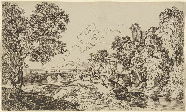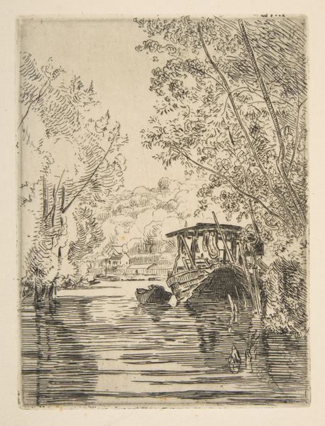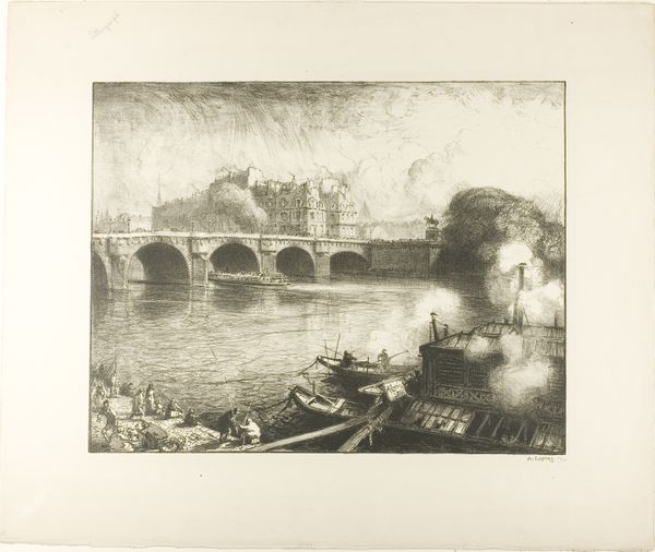 Curator: Today we will be discussing "The Watering Place at the Pont Marie," an etching by Auguste-Louis Lepère, created in 1902. Editor: This piece evokes a sense of bustling Parisian life, yet it’s tempered by a certain rustic quality. The figures seem immersed in everyday labor, grounding the otherwise romantic cityscape. Curator: Exactly. Note the skillful use of line to define form and texture. Lepère employs varying densities of hatching to create a nuanced interplay of light and shadow, defining depth on the water's surface, creating a contrast to the structures on the banks. Editor: The contrast in the etching is quite striking. The labor happening at the shore seems a world away from the privileged promenaders crossing the Pont Marie in the distance, no? We must question the representation of the working class in a Belle Époque Paris rapidly changing with modernization and disparity. Curator: Perhaps. Still, the formal organization is compelling, leading the eye from the foreground figures toward the architectural features, linking labor with city life. Look at the careful alignment of the bridge's curve with the cityscape beyond. Editor: That is an interesting formal feature. Although Lepère frames Parisian laborers intimately alongside working animals, what remains beyond the bridge and riverbank is how industrialism touches everything, a critique of modernization during the time. Curator: To your point, the print displays an interest in the juxtaposition between rural life and urban existence, where it's neither complimentary nor judgemental but observing and framing those distinctions between groups, like those at the water's edge and the buildings and residents overlooking. Editor: This work makes us think about the different ways that people exist in the city. Curator: Precisely. It invites contemplation on not just what we see, but how visual rhetoric organizes those images to influence viewers.