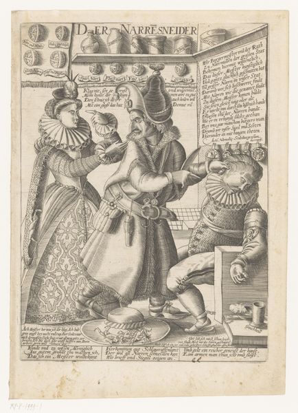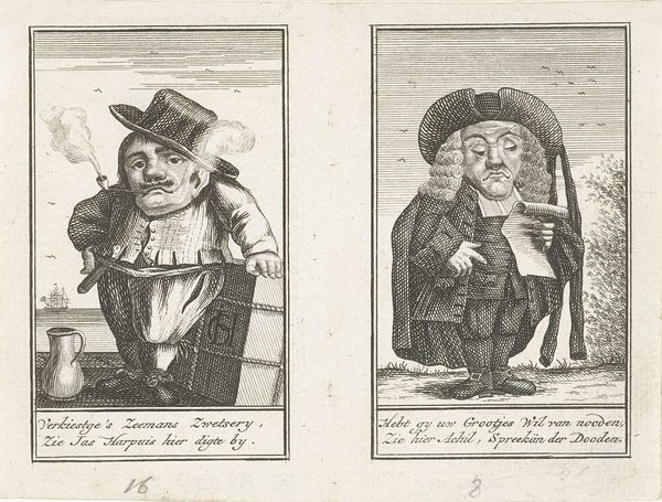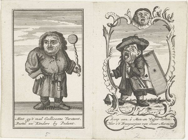 This print from 1720 by Joost van Sassen presents four satirical images related to the speculative bubble of the wind trade. Executed in engraving, the composition is organized into four distinct quadrants, each with a caricature and accompanying text. The use of fine, linear strokes creates a rich, textured surface, enhancing the grotesque features of the depicted figures. The artist uses exaggerated physiognomies to ridicule speculators involved in the financial frenzy. Notice how the figures are rendered as if they are dwarfs, emphasizing their moral diminishment. Each panel employs a visual language laden with symbolism; for example, the figure labeled as an "Actionist" is portrayed with a bestial face emerging from behind, suggesting deception and hidden vices. Van Sassen's strategic use of caricature and the detailed rendering of clothing and objects function as signs within the semiotic system of early 18th-century Dutch society. These distorted representations challenge the established values of prudence and moderation, reflecting a broader critique of economic excess. The detailed execution of the engravings enhances the satirical impact, embedding a critical perspective within the artwork's very structure.