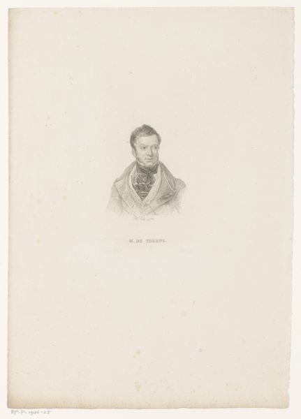 Tiemen Hooiberg made this portrait of Jan Carel Pilaar. The drawing, with a height of 400 mm and a width of 250 mm, captures its subject within a deliberately structured composition. Notice how the artist employs a muted palette of grays and browns to render the figure, set against a neutral backdrop. This choice emphasizes the subject's form through subtle tonal gradations, allowing the details of his attire and features to emerge without overwhelming color. The portrait’s arched frame creates a semiotic space, invoking classical portraiture while subtly confining Pilaar. The precise linework defines the contours of Pilaar's face and uniform, highlighting his presence with an understated elegance. This restrained approach invites viewers to consider the underlying structure of representation itself. In doing so, Hooiberg challenges fixed notions of identity, prompting a re-evaluation of the interplay between form and meaning in portraiture.