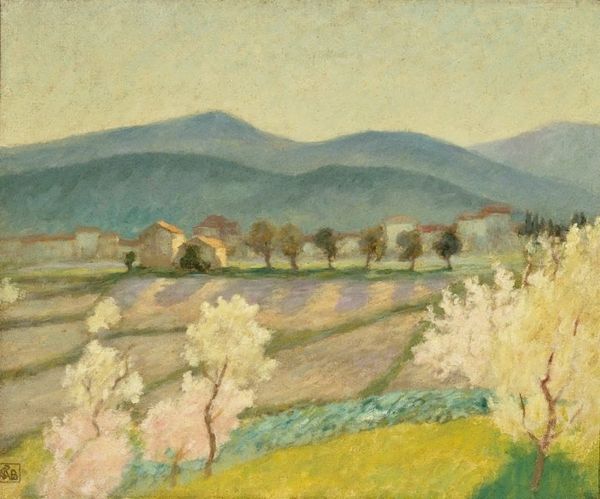 Curator: This is Denman Waldo Ross's "Landscape with Trees, after Dodge MacKnight," housed here at the Harvard Art Museums. Editor: It feels so light and airy, almost dreamlike with those pastel colors and soft brushstrokes. Curator: Indeed. Ross was deeply interested in color theory, specifically how the arrangement of hues could create harmony. Note how the dabs of paint are applied—almost like tiles, building the forms. Editor: I see echoes of Impressionism, but the color choices feel uniquely American. Perhaps this is a romanticized symbol of the countryside? Curator: Maybe so. Ross's concern was less with realistic representation and more with the inherent qualities of the pigments and their arrangement on the canvas. It's a lovely exercise in pure visual experience. Editor: A pleasing little puzzle, then, of color and form. Curator: Precisely.