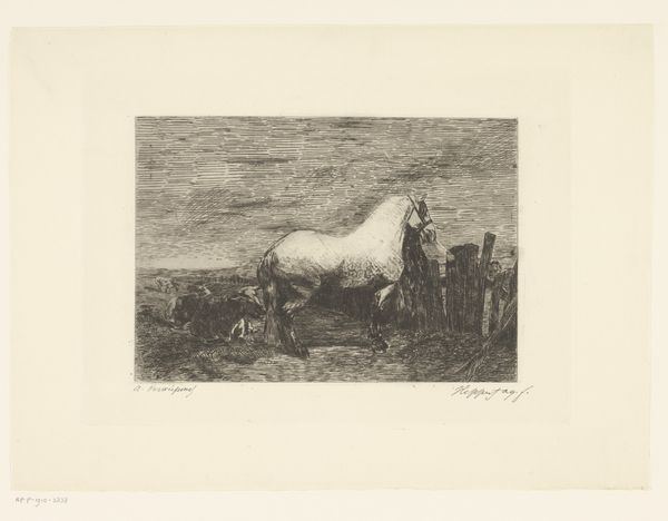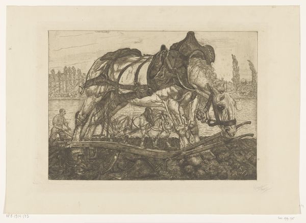 Editor: So, this etching, "Trekpaarden bij de Seine in Parijs," or "Horses Pulling Barges on the Seine in Paris," was created by Pieter Dupont around 1898 or 1899. I'm immediately struck by the contrast; there’s something both powerful and a bit melancholic in the depiction of these working horses. What catches your eye? Curator: The weight. Not just the physical weight of the barges these animals are pulling, but the symbolic weight of their labor. Notice how Dupont uses the symbol of the horse, traditionally linked to freedom and power, and presents it within the confines of industrial Paris. Do you see how the impressionistic style almost blurs the line between animal and machine? Editor: I do. The lack of crisp detail almost makes them part of the landscape, cogs in the wheel of the city. But what does that say about our cultural memory? Curator: It speaks volumes! These images act as potent reminders of a transition. Horses were crucial to the pre-industrial world, becoming increasingly replaced during that time. Dupont captures that moment of overlap and displacement. Look at their downcast heads; is that just the posture of labor, or something more? The weight of their symbolic loss? Editor: I see it now; the horse carries all of our history, of human labor and the natural world, even as it fades from the modern landscape. Curator: Precisely! And that tension, between the past and the burgeoning modern world, is held right there in that image. Etchings like these were affordable, circulated widely. Imagine how it spoke to its contemporary audience and how it continues to speak to us now. Editor: It's like Dupont wasn't just depicting horses, but a whole changing world. This has completely shifted my understanding – thank you! Curator: My pleasure! It is about recognising those symbols in plain sight; visual relics in the everyday.