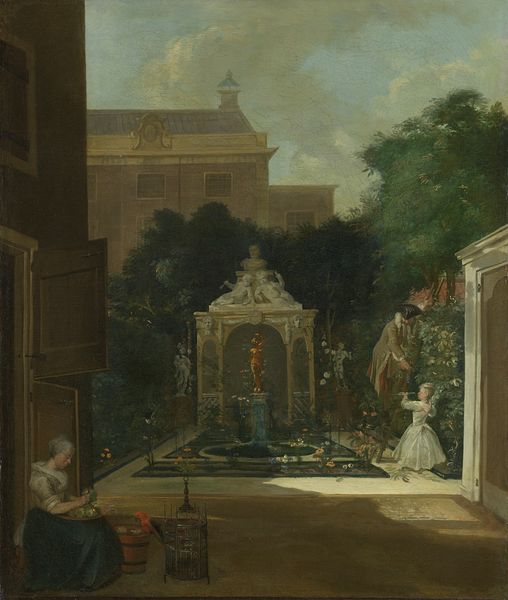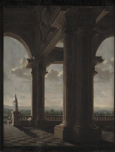 Editor: Here we have Nicolaes de Giselaer’s oil painting, “The Archangel Gabriel Appearing to Zacharias,” created around 1625. What immediately strikes me is the overwhelming architectural setting; it dwarfs the figures and dominates the scene. What do you see when you examine this work? Curator: The emphasis on the architecture is, indeed, significant. Notice how the artist employs linear perspective, guiding the viewer's eye through a succession of arches towards the central event. It's a play of depth and enclosure. The subdued palette, primarily browns and ochres, lends a sense of gravity. Do you observe any dynamic tension between these formal elements? Editor: Now that you mention it, I see how the receding arches and checkered floor do create an artificial depth. The darker hues and light falling into the space definitely adds tension. The architectural elements are interesting, but the narrative becomes less clear as my gaze becomes lost within the constructed interior. Curator: Indeed. However, this emphasis on architectural precision enhances the emotional tenor, which serves as the main content here. Consider how the architectural space functions as a stage setting. The composition is cleverly orchestrated so that you have a sort of stagecraft that brings drama through geometric progression. Note the use of light, as well, creating the dramatic chiaroscuro, creating an effect of both theatricality and intimacy. How does that affect your viewing experience? Editor: It directs my gaze straight into the space, to the altar scene, highlighting Zacharias receiving the revelation, creating a moment of divine intersection. Thinking about perspective in that way clarifies the message. Thanks! Curator: Indeed. Visual architecture and spatial composition are essential for art history, for any art object!