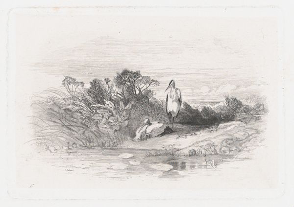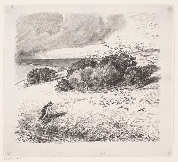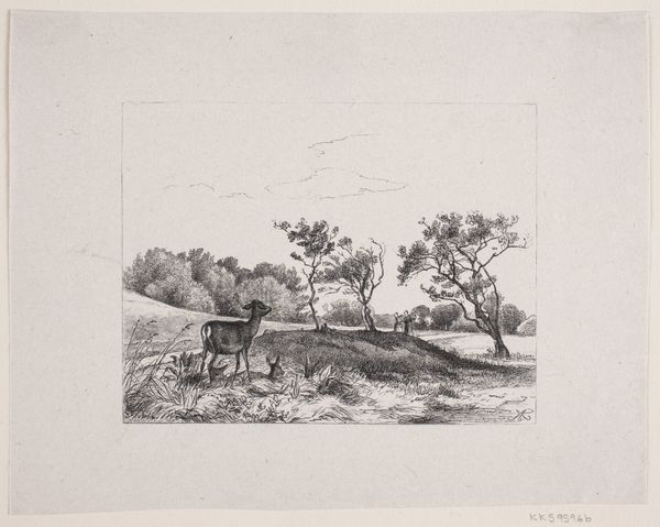 Editor: This is "Landskab med en stendysse," or "Landscape with a Dolmen," an 1858 engraving by Johannes Wilhelm Zillen. It depicts a field with sheep and this huge dolmen structure. The landscape is quite serene, but there's also a certain... solemnity to it. What do you see in this piece? Curator: This print, for me, is deeply connected to questions of national identity and historical consciousness. Zillen situates us within a specific Danish landscape, invoking not only its natural beauty but also its layered past. Notice how the dolmen, this ancient burial monument, dominates the scene. What might it signify about our relationship to those who came before us, and how that history shapes the present? Editor: So the dolmen isn't just a scenic feature, it's a symbol of the past weighing on the present? Curator: Precisely. And think about Romanticism – the art movement that sought to connect with history and landscape, reflecting on mortality and identity. Zillen seems to be asking us to consider how the land carries the memories of its inhabitants, connecting us to broader narratives. Are we considering who had access to creating the land, both within this image and without? Editor: That makes me see the sheep differently, too. Are they a comment on the contemporary use of that same land? Curator: Exactly! Animals often represented rural life in this time. It represents how the land is constantly being altered and inhabited by different people, just as it did many years ago with the creators of the monument. It prompts reflections on continuity, change, and the way landscapes bear witness to both. The way Zillen is choosing to use printmaking too feels linked to the accessibility of this cultural perspective – did this affect his intention and message to the viewer? Editor: I didn't think about that when I first saw it, but it all adds another level of depth to the landscape. It’s more than just a pretty view, it’s about the weight of history and social context! Curator: Absolutely, and recognizing these layers allows us to have richer dialogues.