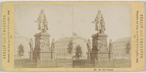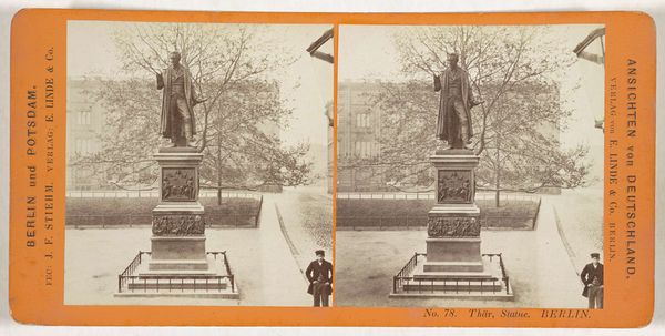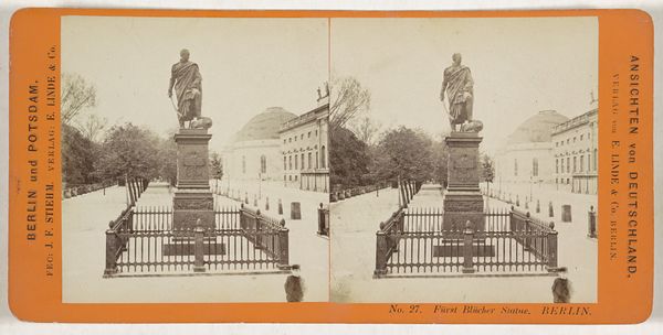 Editor: This photograph, taken by Johann Friedrich Stiehm between 1868 and 1870, depicts a bronze statue of August Neidhardt von Gneisenau in Berlin. The composition is quite formal, almost neoclassical in its rigidity. What historical context shaped the creation and placement of this monument? Curator: It's essential to consider the political climate of the late 19th century. Gneisenau was a Prussian field marshal, a hero of the Napoleonic Wars. Monuments like this weren’t just about commemorating individuals; they were powerful tools in shaping national identity and solidifying political power, especially in the newly unified German Empire. How does the statue's location on Unter den Linden contribute to this understanding? Editor: Well, Unter den Linden was a major avenue in Berlin, so placing the statue there would guarantee maximum visibility and reinforce this image of Prussian strength and military prowess. Was there any resistance to this type of public art at the time? Curator: Absolutely. While these monuments were designed to inspire national pride, they also served as visual reminders of a particular political ideology, one often tied to militarism and the ruling elite. Consider who *isn't* represented. What voices are being silenced by these monumental pronouncements? Do you see echoes of this today in contemporary debates around public monuments? Editor: That’s a great point. Thinking about it that way, I can definitely see parallels to contemporary debates about monuments and their place in shaping public memory. It's not just about the person being honored but also about who is doing the honoring and why. Curator: Exactly. It prompts us to interrogate the power dynamics inherent in public art and question whose stories are being privileged and perpetuated. Editor: This has really shifted my perspective. I now see the statue less as a simple depiction of a historical figure and more as a complex statement about power, identity, and the ongoing struggle to control the narrative of history. Curator: And that's the beauty of engaging with art from an intersectional perspective. We begin to unravel the layered meanings embedded within the seemingly static surfaces.