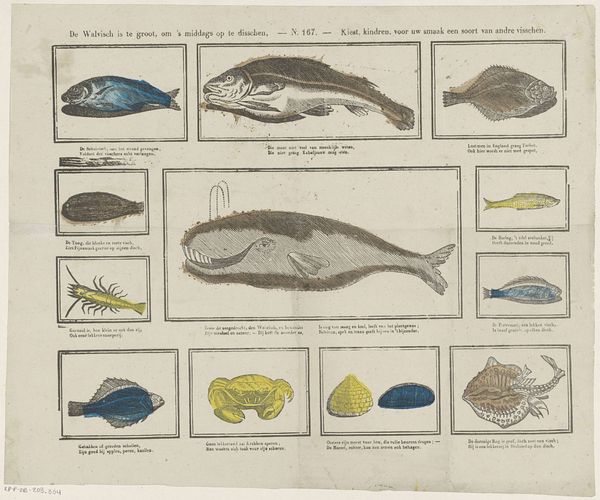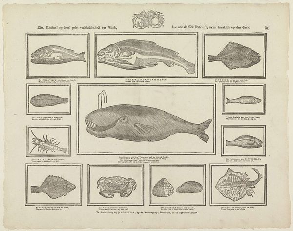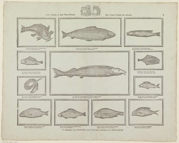 This print, made by Erven de Weduwe Jacobus van Egmont, features various types of fish, accompanied by descriptive text. Published in Amsterdam, this image reflects the Dutch Republic's interest in natural history and commerce. During this period, the Dutch Golden Age, the country was a hub for trade and scientific exploration. Prints like these were part of a broader effort to document and classify the natural world, often with an eye toward economic exploitation. The fish are presented in a way that emphasizes their distinct characteristics, almost as specimens to be studied or commodities to be traded. The language used in the descriptions adds to this sense of detachment, treating the fish as objects of interest rather than living beings. Consider the perspective embedded in this image, which prompts us to reflect on the relationship between humans and nature, and how economic and scientific pursuits shape our understanding of the world.