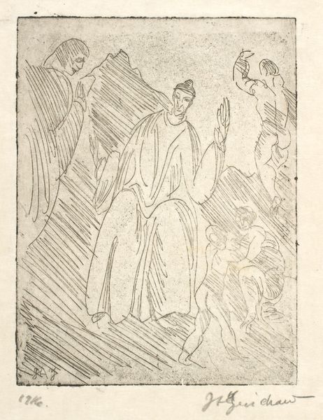 Edward Burne-Jones made this study for "The Fates" using chalk on brown paper. Immediately, the composition strikes you with its tiered arrangement of figures, a somewhat compressed space that directs your eye upwards. The limited palette focuses our attention on the structure of the piece, the lines and forms standing out against the warm ground. This approach to composition relates to Burne-Jones’s broader artistic interest in classical themes and his engagement with the Pre-Raphaelite movement. The Fates, mythological figures controlling destiny, are rendered with a deliberate emphasis on line and form, typical of Burne-Jones' aesthetic. We can see here the artist’s interest in not just representing a scene, but in structuring it to convey a deeper meaning about human existence. Notice, in closing, how the composition uses the interplay of vertical and horizontal lines to create a sense of balance. This is a deliberate choice, reflecting the artist's interest in the formal qualities of the work and highlighting the underlying structure of the narrative.