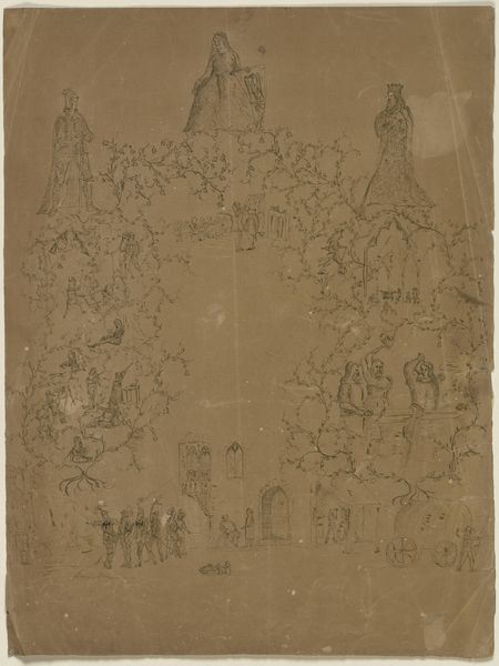 Editor: This is a watercolor painting by G. Acronius, created around 1883, titled "Allegorische voorstelling voor de Internationale Tentoonstelling te Amsterdam, 1883". It depicts a somewhat faded, yet elaborate allegorical scene. What's most striking to you about its historical context? Curator: Well, considering it was designed for the Amsterdam International Exhibition, it’s essentially a piece of promotional material, elevated to high art. Look at how Classicism, a style associated with power and stability, is employed here. How do you think that choice reflects the ambitions of the exhibition and Amsterdam as a host city? Editor: I guess it was trying to project an image of sophistication and historical importance. But wouldn't something more modern have been fitting for an international exhibition? Curator: That's a great question! It tells us a lot about the societal expectations of the time. Organizers likely believed Classicism provided a veneer of timeless prestige, suggesting that Amsterdam and the Netherlands were rooted in established cultural values. Do you see how that contrasts with the exhibition's supposed celebration of the "new"? Editor: Yeah, I get it. It's like using history to validate the present. It is interesting how the form of the classical style communicates different values depending on the moment in time and cultural forces, like marketing! Curator: Precisely! And the history of exhibitions like this demonstrates how intertwined art and politics always are, shaping public perception through carefully curated imagery. This wasn’t just art for art’s sake; it was art *for* national and international image-making. Editor: So, beyond aesthetics, this painting serves as a visual document of late 19th-century societal values and ambitions, tying in the relationship between cultural power and national identity. That really shifts my perspective on promotional art! Curator: Indeed. By examining these layers, we begin to understand how seemingly simple artworks like this hold complex narratives about the forces shaping society at any given moment.