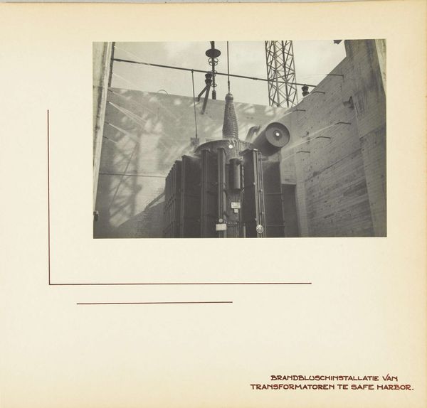 Curator: This photograph, taken in 1936 by Wouter Cool, shows a warning sign near what appears to be a dam or power plant in the United States. It’s a striking composition, wouldn’t you agree? Editor: Absolutely. There’s something monumental and imposing about that wall; it seems to stretch endlessly into the frame. But I'm immediately drawn to the sign itself. "Safety First." You almost feel the urgency and the physical risks involved in this sort of industrial work. Curator: Precisely! The geometry is intriguing, how the angles of the scaffolding create a counterpoint to the implied line of the dam's surface. And the tonal range is quite narrow, focused on light and shadow contrasts that contribute to the overall sense of monumentality. Editor: Yes, the material context feels central here. You can almost feel the weight of the materials being used to construct the dam, and the crude, almost ad-hoc construction of the wooden safety sign. These things really root the work in a specific historical moment—one where labor and massive engineering projects intersect. Curator: The interplay between text and image is masterful. The message about safety acts as an organizing principle for the entire composition, dictating the visual narrative. The hierarchy is clear—ensuring everyone is able to make it home safely. Editor: I'm fascinated by the raw practicality of the piece. It feels less like a detached artistic statement, and more a direct communication intended for the workers and foremen at the site. It speaks volumes about the labor conditions of the era and this tension between rapid development and human well-being. Curator: And notice the placement of the workers themselves; dwarfed by both the structure and the signage, they add a layer of perspective while also visually underscoring the inherent dangers of their work. There’s a clear intention of using scale to underscore meaning here. Editor: It really captures a moment of tremendous ambition and massive physical exertion, tempered by a basic human concern for safety and survival. The materiality of that ambition—concrete, steel, and human effort—is really present. Curator: I'd say this photograph demonstrates a fascinating blend of aesthetic awareness and pragmatic messaging. Editor: I'd agree—it leaves me with much to think about regarding the cost of progress and those who are at the very center of that endeavor.