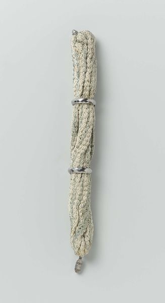 This is an anonymous model of a windsail, its length measures 120 cm, and its diameter is 9.1 cm. Immediately apparent is the work's verticality. The use of neutral tones, dominated by off-whites and creams, renders a sense of subdued elegance. The material mimics the appearance of natural fibers, such as bamboo. The artist has skillfully manipulated the material to create a series of segmented, tubular forms connected by small rings, which further emphasizes the work's vertical organization. The piece does not demand your attention with vibrancy, but draws you in. Consider how the linear arrangement challenges conventional notions of sculptural form. Its elevation is stark, and it reduces the piece down to its essence as a channel for the wind. Ultimately, the model of a windsail invites a meditation on form and function. Its enduring appeal lies in its capacity to evoke ideas about movement, energy, and the underlying mechanics of the world around us.