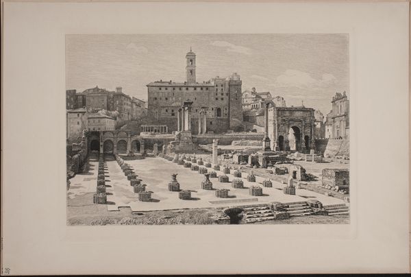 Curator: Welcome! We're standing before "Caravanserai-i-Shah te Qazvin," a print created by Eugène Flandin between 1843 and 1854, currently residing at the Rijksmuseum. The print is a lithograph, giving it this very interesting textured, almost ephemeral quality. What’s your first impression? Editor: There's a quiet stillness that almost contradicts the apparent bustling activity in the courtyard. A hushed, almost melancholic tone amidst this place meant for exchanging goods and resting. I’m immediately drawn to the subtle gradation of the pale palette. Curator: That’s an interesting observation! Flandin’s travels through Persia and the Middle East came at a historical moment when the West was deeply interested in understanding the socio-political and cultural identity of those regions. Prints such as this fed a particular kind of imperial imagination. The question remains of how truthfully they conveyed the subject, or whose reality was centered. Editor: I see the dome of what looks like a mosque rising in the background, almost a constant, looming presence. It immediately makes me consider the importance of faith as a social structure – one of constant orientation, visually and spiritually – for the people frequenting the caravanserai. The symbol of power looms above these ordinary, necessary actions of travel and trade. Curator: Absolutely. It's essential to look beyond the purely picturesque here and consider how the artist chose to represent, or perhaps even misrepresent, cultural norms and power dynamics. Editor: Yes, it goes beyond mere representation. The way light plays, the way the human figures blend so seamlessly into their surrounding – almost a pastiche – this, I believe, communicates something deeply embedded in shared cultural memory of public spaces like this. The visual language tells us a lot about continuity and perhaps the lack thereof, too. Curator: Do you find this particular artwork romanticizes the caravanserai and thus an element of its real day-to-day conditions might be washed out? Editor: Not quite romanticizes; it’s too quiet and pale to be romantic. Evokes a world steeped in time and ritual more than fantasy. There are other stories unfolding beneath what at first appear to be images of pure function and faith, I am more certain of this as I see it now. Curator: This discussion truly reveals how much this print has to offer from diverse points of view. Thank you for sharing your insights. Editor: It was my pleasure; it’s been really insightful diving into this artwork's blend of visual storytelling. Thank you.