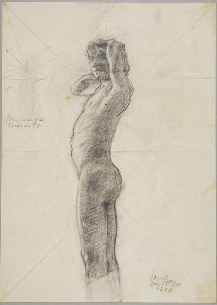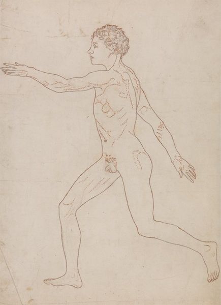 Editor: This is Richard Nicolaüs Roland Holst’s “Zittende naakte jongen met naar voren gestrekte armen,” created sometime between 1878 and 1938, using pencil. I’m struck by the dynamism of the pose and the sketchy quality of the lines. What do you notice first? Curator: I'm immediately drawn to the strategic use of line weight. Notice how Roland Holst employs a lighter touch to define the form, creating a sense of volume and depth, even with such minimal means. It is line itself, with variations in pressure and density, that articulates the structure. Editor: It does look like he focused more on the contours than shading. So, it's less about modeling with light and shadow and more about defining shape with line itself? Curator: Precisely. And consider the composition as a whole. The figure occupies a distinct spatial relationship within the picture plane, pushing forward and outward. This positioning enhances the work's visual tension and contributes to the overall aesthetic experience, yes? Editor: I hadn’t really considered the negative space. What is the impact? Curator: It throws the emphasis back onto the artist’s skillful contour drawing. It allows a dialogue between presence and absence, defining the figure as much by what is there as by what is not. Are you interpreting this aspect similarly? Editor: I am now! It seems like Roland Holst is inviting us to really appreciate the fundamentals of drawing—line, shape, form—divorced from external narratives or symbolic meaning. Thanks for highlighting those elements! Curator: It has been enlightening to focus purely on form and structure. This exercise reveals the drawing’s aesthetic strengths without relying on biographical details or external contexts.