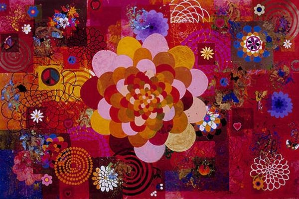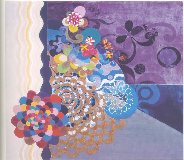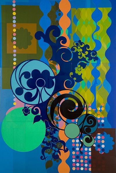 Curator: Wow, this explodes with joy! It's almost like stepping into a vibrant carnival. Editor: Indeed! Today we are exploring “Dança Dos Reis” (Dance of the Kings). It's a mixed-media painting by the renowned Brazilian artist Beatriz Milhazes. Though the date of this piece is unspecified, it aligns with her larger body of contemporary, abstract work. Curator: "Dance of the Kings," yes! It vibrates. Look at those colors—the jewel-toned blues, the fiery reds, all dancing together in these overlapping concentric circles. It's less about representation and more about evoking a feeling, a pure sensory experience. Editor: Exactly. Milhazes draws upon a vast array of influences from Brazilian culture—the Baroque, decorative arts, and even the energy of Brazilian music and dance which she transmutes into visual form, challenging conventional aesthetics within art's institutions. Curator: There’s a rhythm in this repetition. You see it, right? It is as if each layer builds upon the last, creating this sense of joyful, chaotic order. And that impasto! You can almost feel the texture. Editor: Absolutely, the application of paint, with its pronounced texture, enhances that feeling. Think about the larger art market at the time... and Milhazes asserting her own identity within it, making an argument for joy, sensuality, and Brazilian identity, during a period where minimalism reigned supreme. Curator: Well, the canvas itself seems to pulse with that joy. Do you know, when I look at this, I feel connected to something primal. The circles and repeating patterns remind me of mandalas. Editor: I see that too. So many levels working in conversation. It pulls from so many corners of artistic traditions, remixing and reinterpreting. Milhazes seems to say the traditions of art and society are ever present, whether we like it or not. Curator: A really thought-provoking piece. Editor: It’s an excellent way to consider both art as artifact and expression, so thank you for lending us your eye to "Dança Dos Reis"!